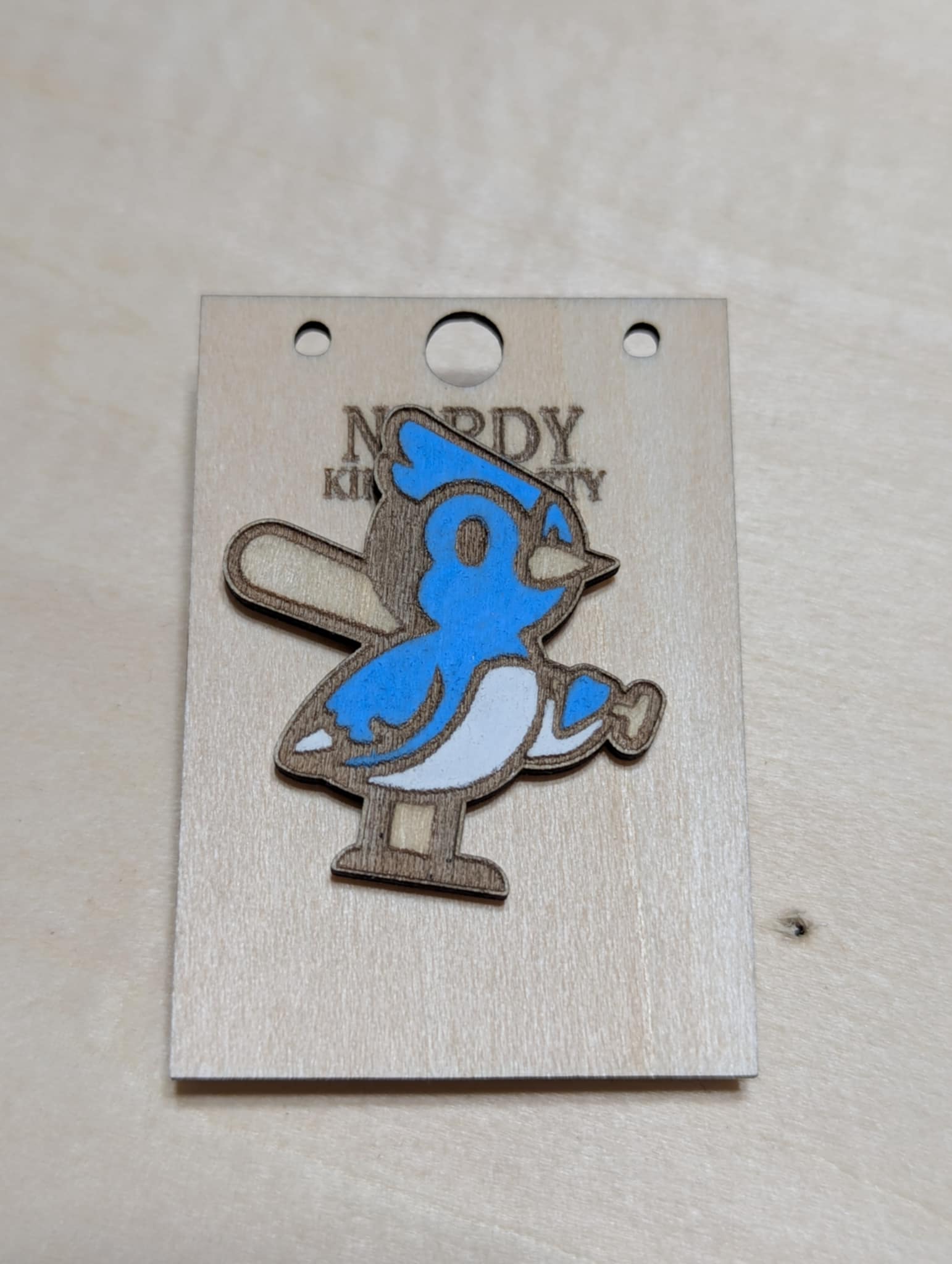 Get ready to soar with the Blue Jay Pin. This quirky pin is made from laser cut, engraved, and hand painted wood, giving it a unique and playful touch. Wear it on your lapel or bag to add a touch of fun and humor to your style. (Fly above the rest with this one-of-a-kind pin!)