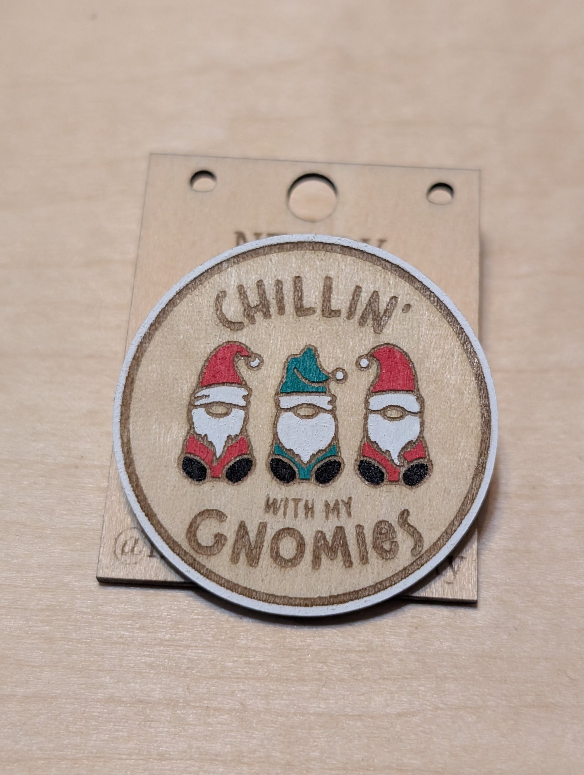 Expertly crafted, the Chillin With My Gnomies Pin is made in Canada with precision laser-cut wood and hand-painted details. Made to order, it ships quickly in 5-8 business days via Chit Chats on Tuesdays and Fridays. Get your hands on this unique and personalized accessory for a touch of whimsy to any outfit.
