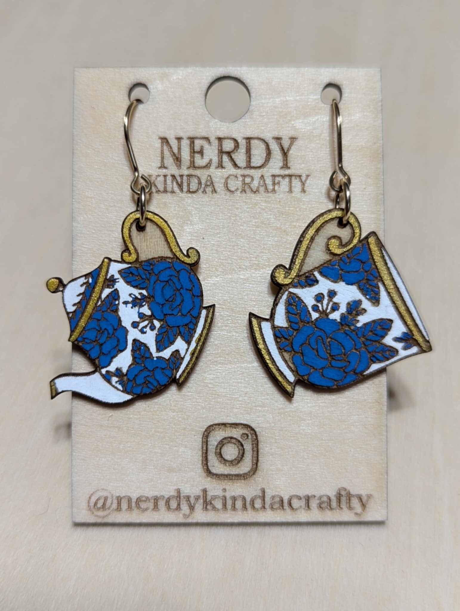 Crafted with intricate detail, these china-inspired tea kettle and cup dangle earrings are a unique accessory that embodies elegance and charm. Made with lightweight and hypoallergenic materials, these earrings feature sterling silver hooks and laser-cut, engraved wood charms. Each piece is a work of art that adds a touch of sophistication to any outfit, making them a must-have for those who appreciate the beauty of fine craftsmanship.