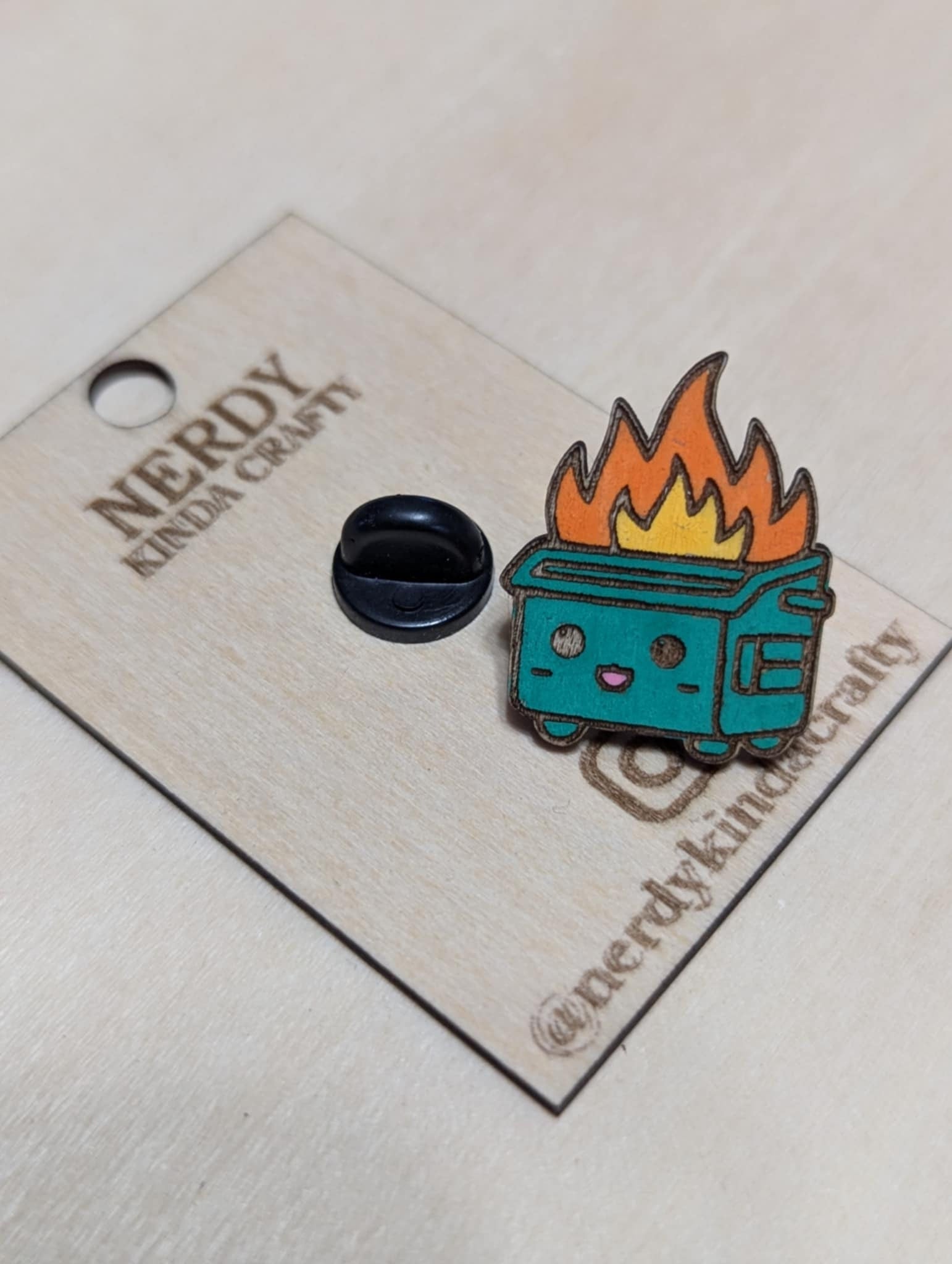 Crafted with precision, this dumpster fire pin is more than an accessory – it's a statement piece. Made from lightweight, laser cut, and engraved wood, this pin captures the essence of chaotic beauty. Add a touch of whimsical flair to your outfit with this unique and eye-catching accessory.
