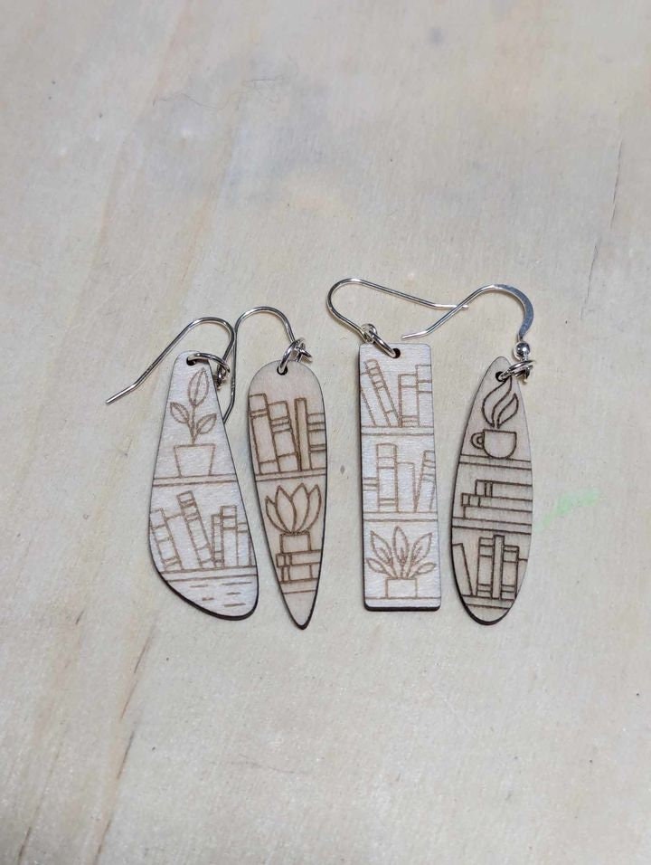 Imagine decorating your favorite bookshelf with a touch of elegance and charm. The Bookshelf Dangles offer a unique accessory crafted from lightweight, hypoallergenic sterling silver. Each piece features intricately laser-cut and engraved wood, adding a delightful and artistic flair to your home decor. Embrace these dangles to infuse your space with style and personality effortlessly.