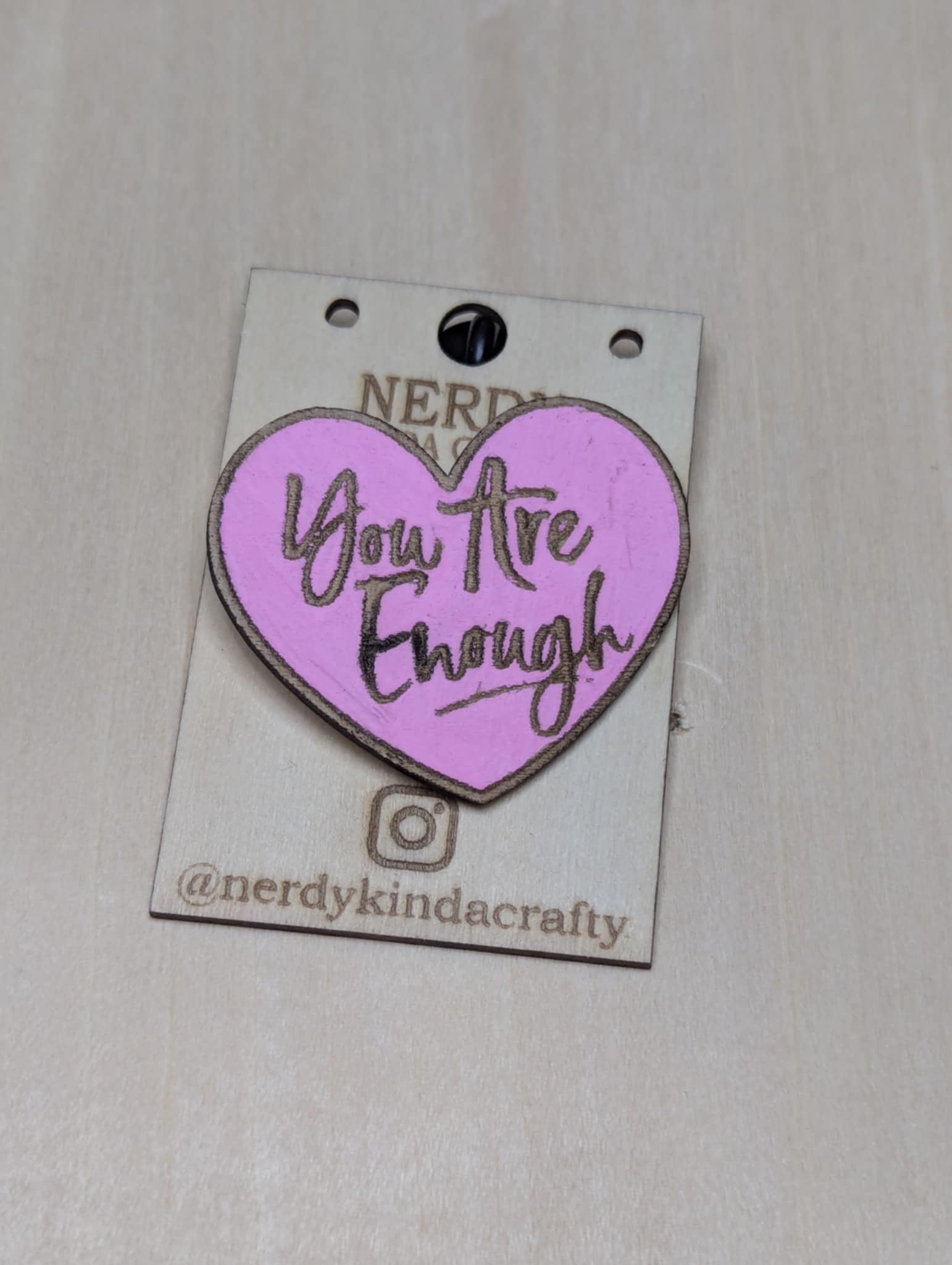 Step up your pin game with the You Are Enough Pins. Laser cut, engraved, and hand painted, these quirky pins add a playful touch to any outfit. Show the world you're enough (pun intended) and embrace self-love with these unique accessories. Limited quantities available, so grab yours now!